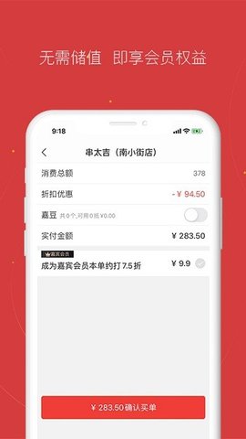 使用贵客嘉即可获得嘉豆,后续消费中直接抵扣现金。
